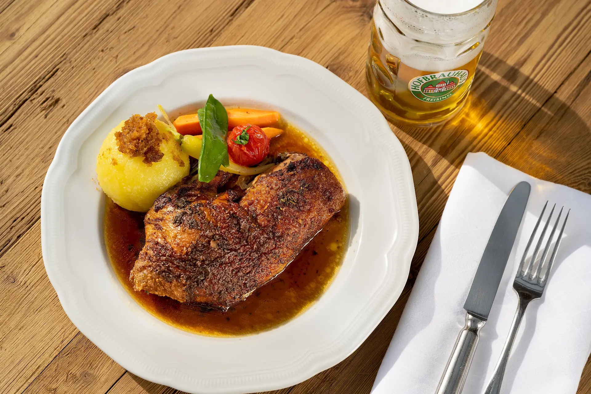 In unserer Küche steht Regionalität, Saisonalität und Qualität an erster Stelle. Wir verwenden bevorzugt regionale Zutaten aus Bayern und bereiten alle Gerichte mit größter Sorgfalt zu. Genießen Sie unsere Spezialitäten in gemütlicher Atmosphäre – in der urigen Gaststube, im stilvollen Esszimmer mit Kamin oder auf unserer sonnigen Terrasse.